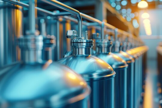 Rows of steel tanks for beer fermentation and maturation in a craft brewery
