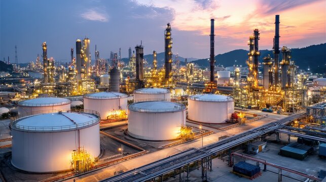 Massive industrial complex featuring storage tanks and distillation towers operates under twilight illumination
