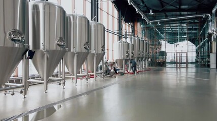 Shiny metal beer tanks at the modern brewery. Wide angle panoramic view, camera is moving