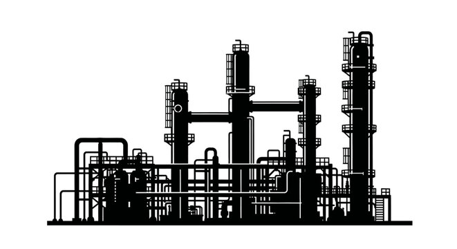 A stylized black and white illustration of an industrial refinery complex, showcasing tall distillation columns and intricate pipework.
