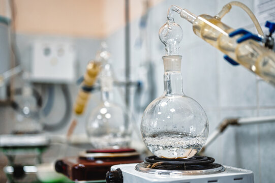Laboratory equipment for distillation.Separating the component substances from liquid mixture with evaporation and condensation. Industrial chemistry. . Erlemeyer flask, apparatus