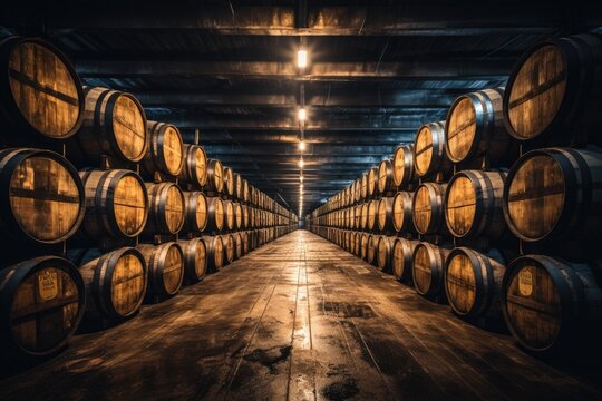 Captivating confident whisky distiller in a traditional Scotland distillery, subtly raising an eyebrow. Embodying assurance amidst barrels of spirits.