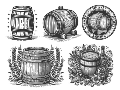 whiskey and beer keg barrel with floral, grain, and decorative elements in retro style set collection bundle sketch engraving generative ai vector illustration. Scratch board. Black and white image.