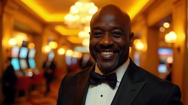 Black African American smiling casino host interacting with guests, creating an unforgettable VIP atmosphere