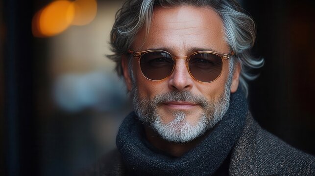 portrait of a distinguished middleaged man with saltandpepper hair and designer sunglasses casual yet stylish attire exudes confidence and sophistication against an urban backdrop