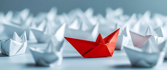 leadership successful business startup or competitive advantage theme a red paper boat distinguishing itself from a sea of white boats