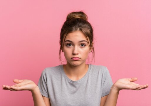 A Young Woman Expressing Uncertainty and Confusion with a Pink Background.