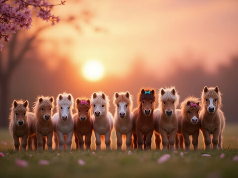 Twelve miniature horses on a sunset grassy field, varying shades of brown and tan Sky with orange, pink, and blue hues Horses face camera, no distinguishing marks Long shadows, peace - AI-Generated