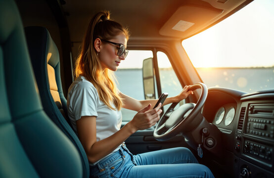 Young female truck driver sits in cab of big rig, uses phone driving. Pro woman in uniform. Dangerous driving situation. Truck driver looks at phone. Photo transport industry worker. Potentially