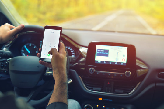 Distracted Driving Danger: A close-up shot of a man using his mobile phone while driving, highlighting the inherent dangers of distracted driving.
