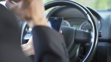 Close up male hands texting on smartphone while driving car