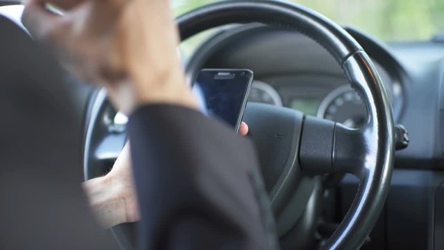 Man Typing Text Message On Mobile Phone While Driving Car