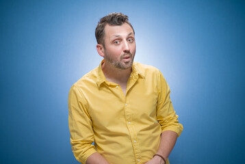 Distracted young man looking at other man over blue background, dresses in yellow shirt. Seducer man