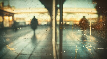 Blurred figures stand beyond distressed glass texture.