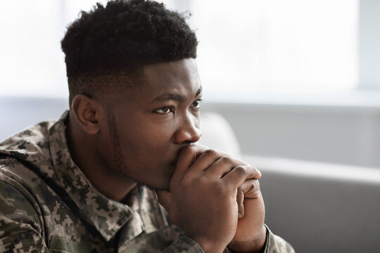 Upset black african man reading bad news in message looking at phone screen sitting on couch