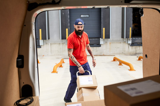 Worker loading freight into the car.
