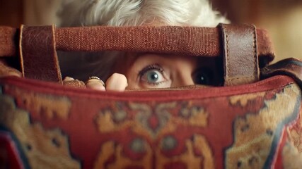 Intense stare of a woman hiding behind a patterned textile bag expressing fear and surprise