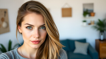 pretty caucasian woman keeping an eye on you, not trusting, watching and staying alert and vigilant. home interior concept