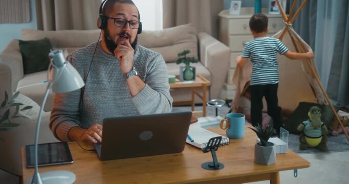 Father having an online video conference call at his home desk while kids play in the background with a toy tent. Real work-life balance and multitasking parenting in a modern cozy home.