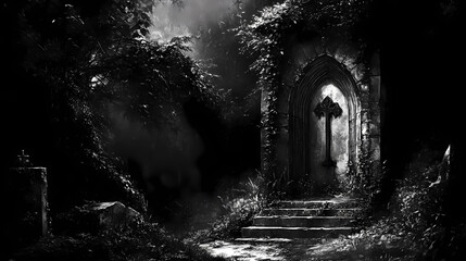 A disused chapel engulfed by creeping vines, its altar obscured by shadows. [Hollow Monoliths] | Forgotten Altars | erased worship. Illustration