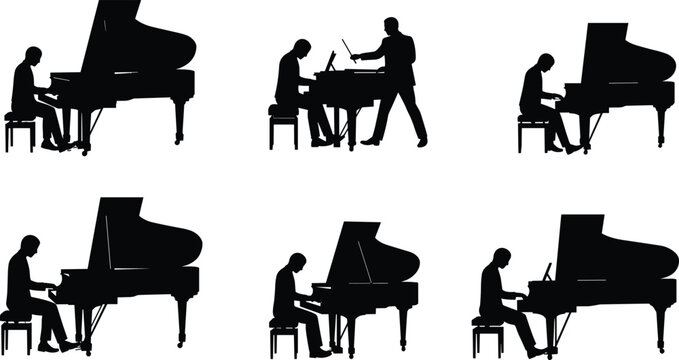 Collection of classical pianist silhouettes in various poses, including playing the piano and with a conductor, for music, orchestra, and band themes