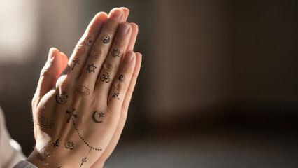 Hands with religious symbols clasped in prayer, showcasing diverse faiths and beliefs through intricate designs. Gesture of unity and respect for World Religion Day,