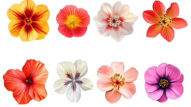 Colorful flowers with various blooms on white isolated background. Polychrome Flower. Illustration