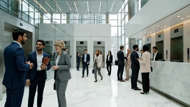 Busy multi ethnic group of business people walking and talking in a modern corporate building lobby with elevators and a reception desk, embodying a dynamic and professional work environment