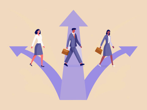 Diverse business professionals walking on diverging paths representing career choices and future direction