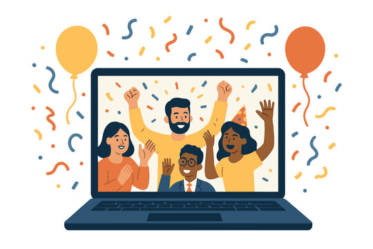 Vector cartoon flat illustration of diverse people dancing and chatting as they celebrate the holiday during a virtual New Year company party via video call