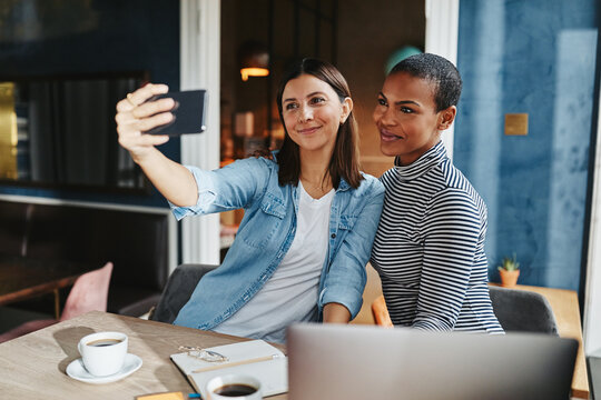 Smiling female entrepreneurs sitting together in a cafe taking selfies