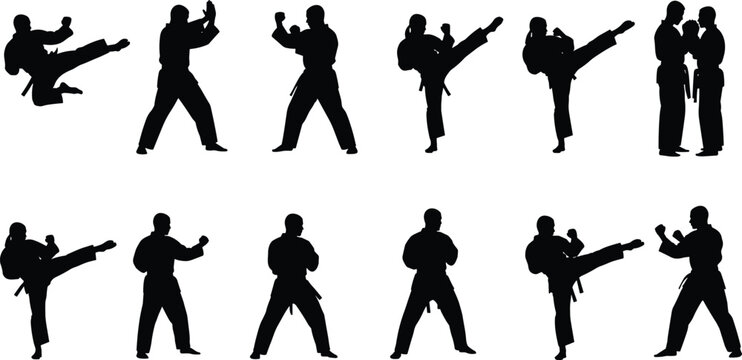 Set of martial arts silhouettes featuring karate and taekwondo fighters in various poses, high kick and defensive stances, combat sport vector