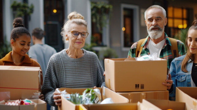 Diverse Group of Volunteers Holding Food Drive Donation Boxes Outdoors