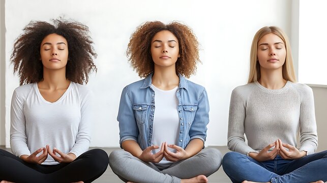 Three young women of diverse ethnicities practice meditation together, promoting calmness and connection in a serene indoor setting, with soft natural lighting.