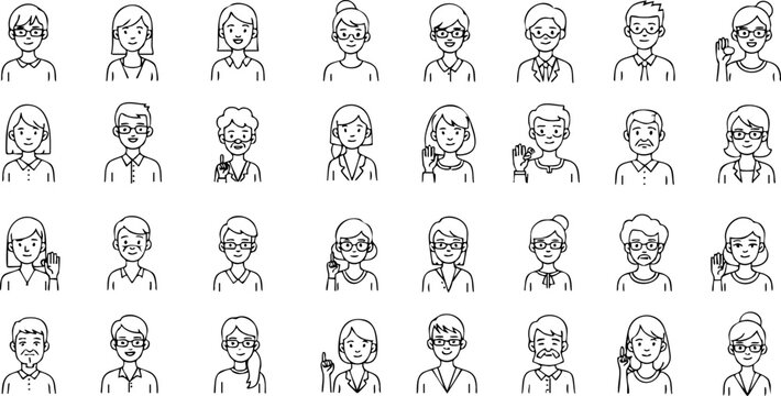 A collection of simple, faceless avatar icons in black and white, showcasing diverse hairstyles and clothing in a modern, minimalist vector style, perfect for user profiles.