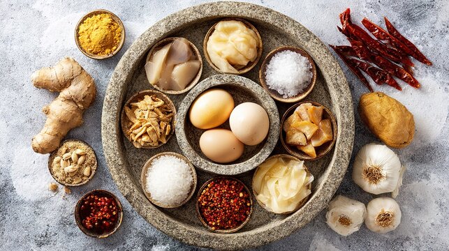 A collection of diverse ingredients including eggs, ginger, garlic, and spices