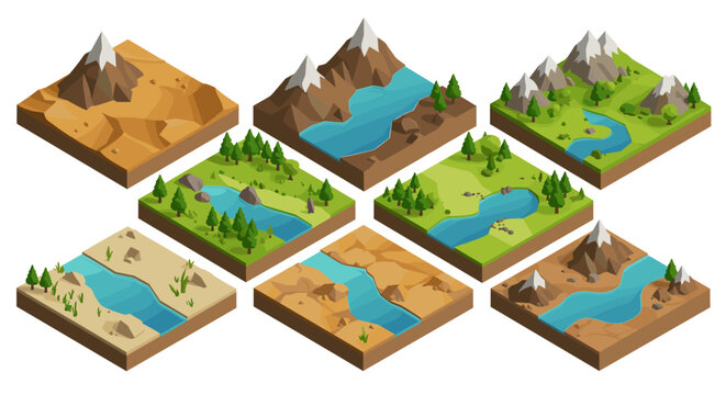 Set of isometric vector illustrations of diverse landscape elements for design and animation projects