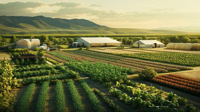 Scenic agricultural landscape featuring diverse crops and innovative farming structures
