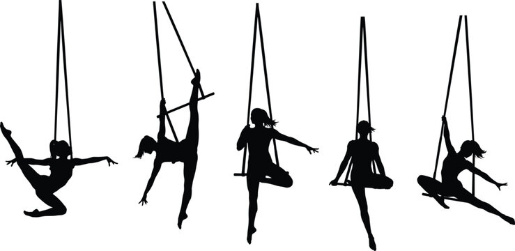 Five female aerial silks performers silhouettes hanging from ropes in various dynamic poses