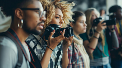 A diverse group of photographers sharing their portfolios and discussing techniques with copy space