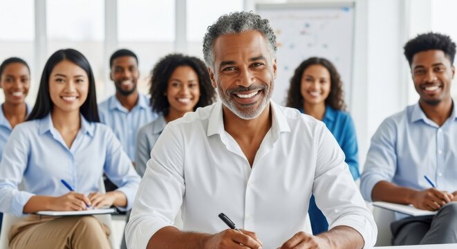 Group of diverse professionals attending a training session in a bright, modern office space during daylight hours