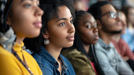 group of professionals attending workshop, with focus on confident woman in foreground. setting is formal, with blurred colleagues in background