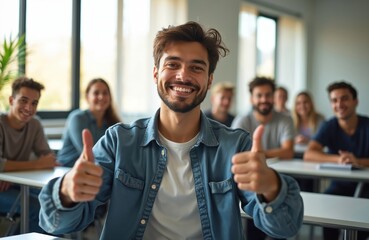 Smiling young man gives two thumbs up in bright modern classroom. Students actively learn together, attending professional lecture training session. Diverse group enjoys education, personal growth.