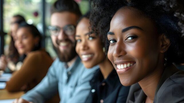 Multiracial business team attending a presentation in a modern office. A diverse group of colleagues gather for a training session.