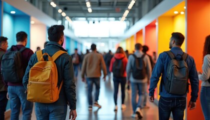 Vibrant career fair scene features diverse people interacting with recruiters at company booths. Individuals walk through colorful, modern hallway, engaging in networking, job seeking. Atmosphere