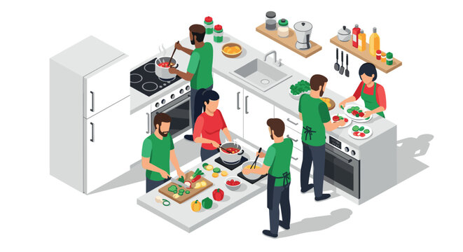 Isometric group cooking in modern kitchen with diverse team preparing meals