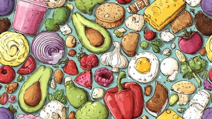 Diverse array of colorful food items arranged on a bright turquoise background, whimsical art