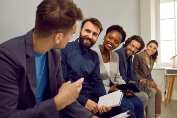 Business team meeting in the office, working together, making presentations, and having discussions. Group of happy multiracial men and women sitting in a row and discussing each other's ideas