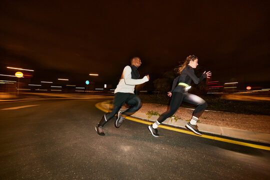 Energetic diverse people running together on street