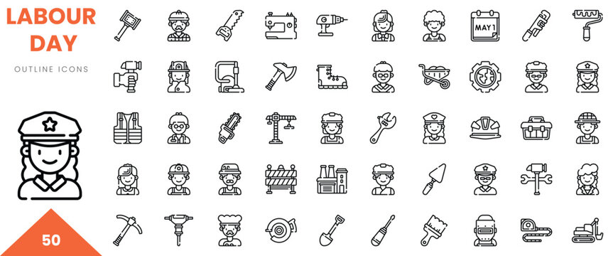 Diverse Labor Day icons, including professions like police, construction, and healthcare in a cohesive outline style.